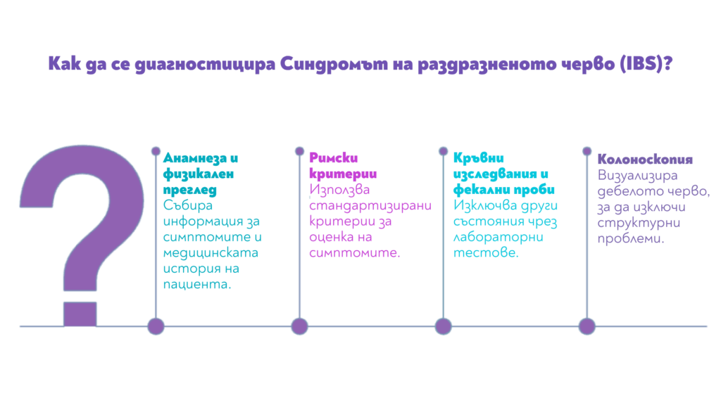 Диагностичният процес обикновено започва с подробна анамнеза и физикален преглед. Лекарят ще използва т.нар. „Римски критерии“, които изискват наличието на повтаряща се коремна болка (поне веднъж седмично през последните 3 месеца), свързана с два или повече от следните фактори: свързана с дефекация, промяна в честотата на изхождане или промяна във формата на изпражненията. За да се изключат други състояния като целиакия, възпалителни чревни заболявания (болест на Крон, улцерозен колит) или инфекции, могат да бъдат назначени кръвни изследвания, фекални проби, а понякога и колоноскопия.
