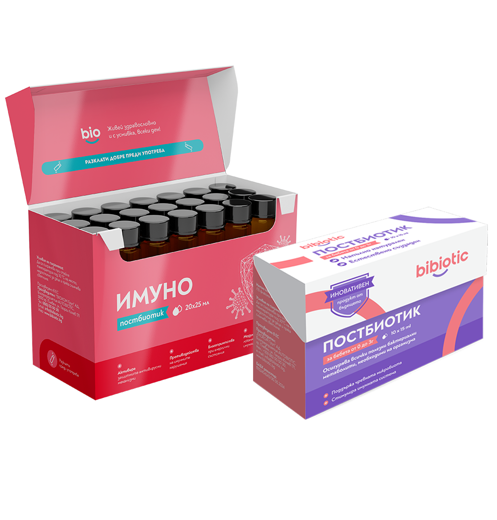 Пакетът Bibiotic® Бебе + Bibiotic® Имуно обединява два постбиотика с допълващо действие – за изграждане на здравословен чревен микробиом при бебета и за модулиране и подсилване на имунната система при по-големи деца и възрастни.