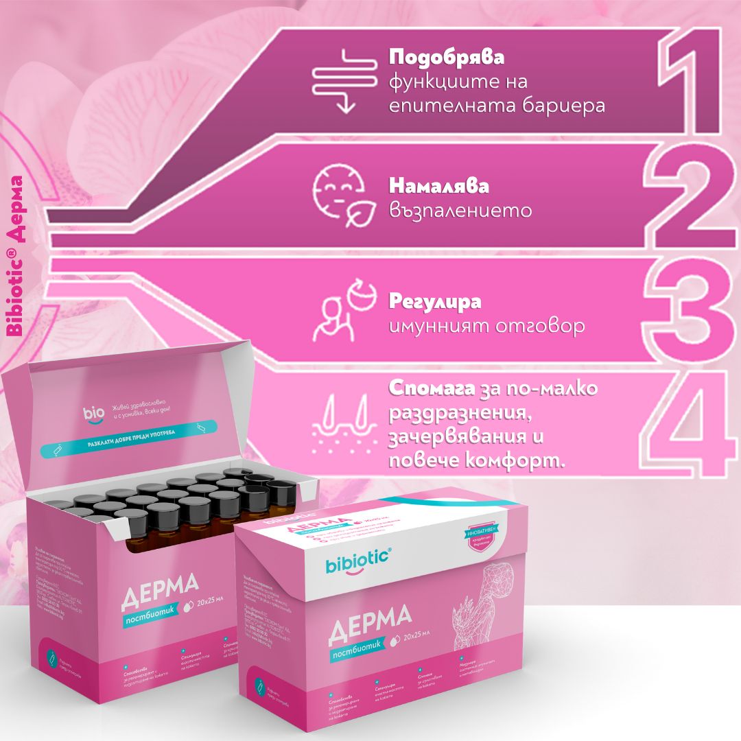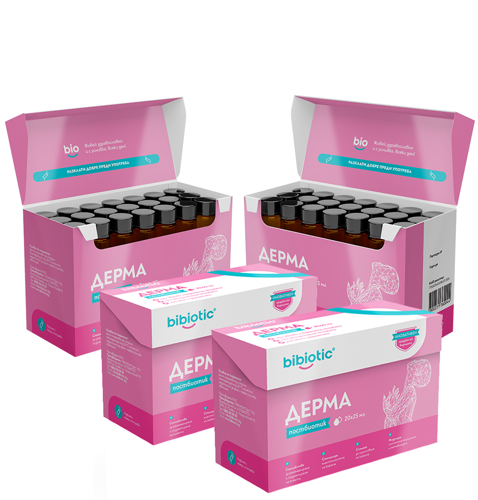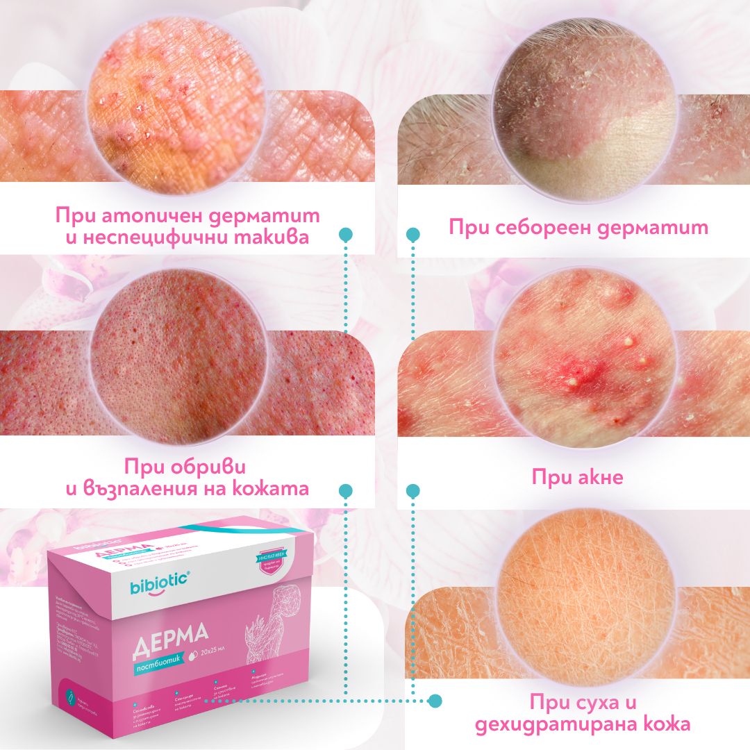 Bibiotic® Дерма е създаден да подпомага кожата, склонна към акне, като действа върху един от основните фактори за възпаленията – нарушената връзка между червата и кожата.