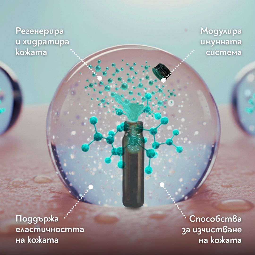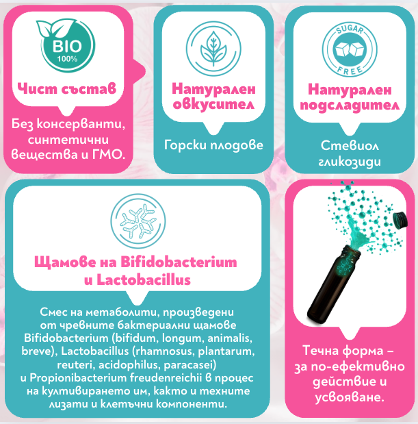 Състав: Смес на метаболити, произведени от чревните бактериални щамове B. bifidum, B. longum, B. animalis, B. breve, L. rhamnosus, L. plantarum, L. rеuteri, L. salivarius, L. acidophilus и L. paracasei в процес на култивирането им, както и техните лизати и клетъчни компоненти.