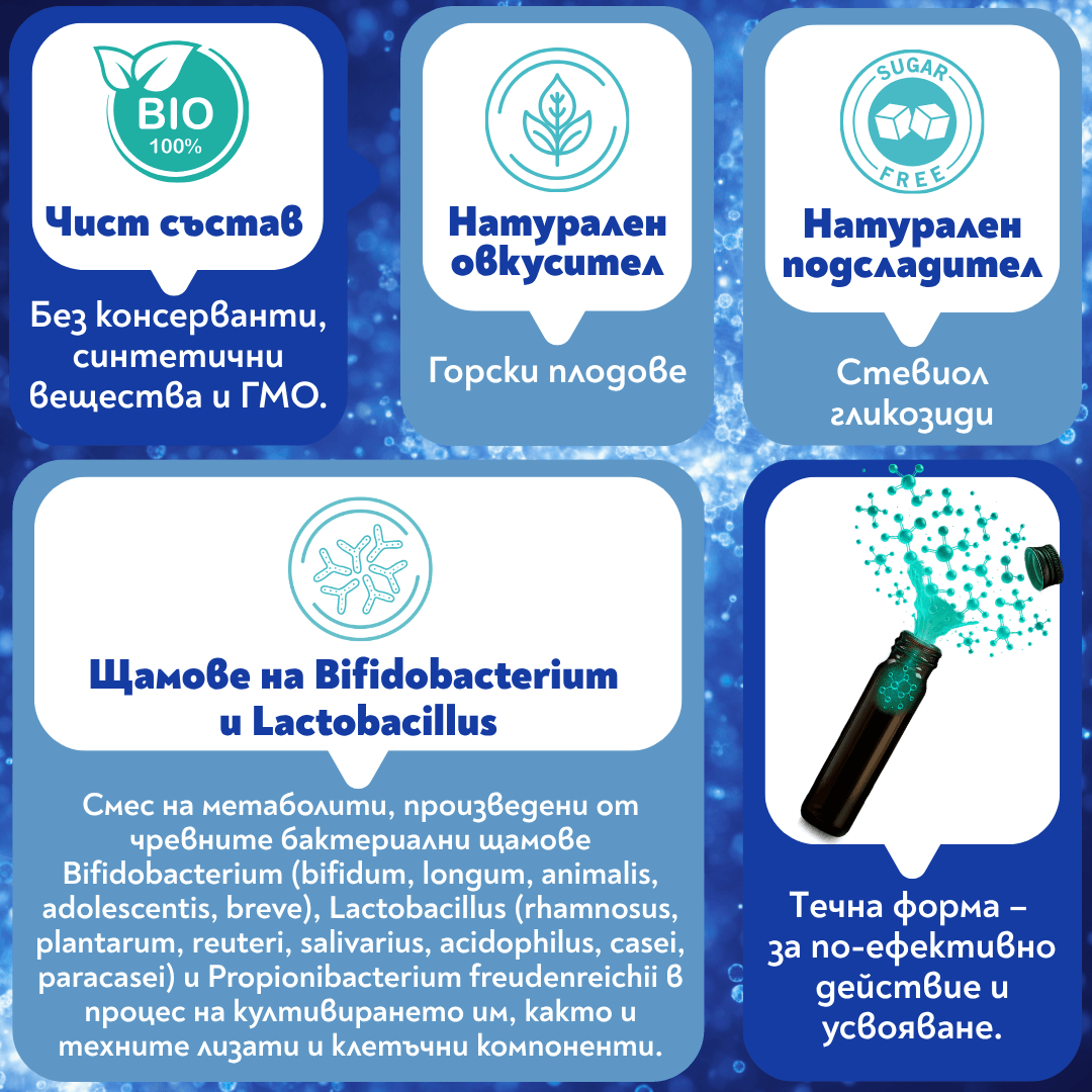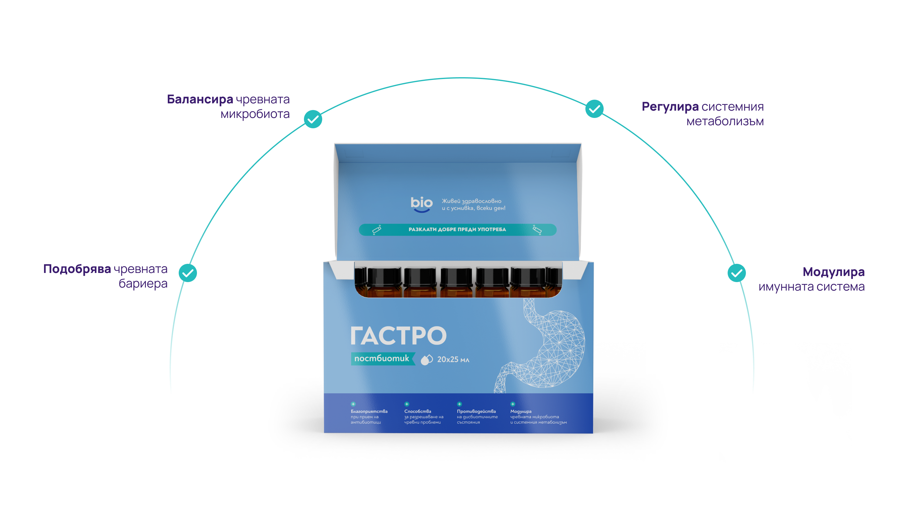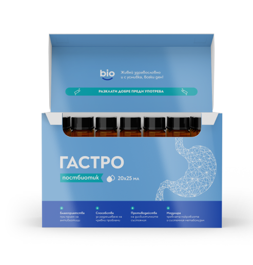 Постбиотикът „Bibiotic®Гастро“, като мощен микробиотен регулатор се явява ефективно антидисбиотично средство. Един от основните проблеми на нашето съвремие е чревната дисбиоза. Нашият чревен тракт се населява от трилиони микроорганизми от различни видове. Всеки вид изпълнява строго определени функции, представляващи звено от много сложна метаболитна верига. Дори и вредните микроорганизми, изпълняват полезни задачи. Например, обучават имунната система и я поддържат активна. Затова няма добри и лоши бактерии. Важен е балансът между тях. Нормалното, балансирано състояние на микробиотата, се нарича нормобиоза или еубиоза. Нарушаване баланса на микробиотата, при което едни микроорганизми увеличават популацията си за сметка на други, се нарича микробен дисбаланс или дисбиоза. Вследствие, се нарушава количественото и качествено съдържание на произвежданите от бактериите метаболити. Това води до появата на различни здравословни проблеми, като подуване, газове, спазми, диария, запек, коремни болки, умора, алергични реакции, метеоризъм, нарушена имунна функция и пр. Причините за развитие на дисбиоза могат да бъдат от различно естество – поглъщане на токсини от замърсената околна среда, ситуации на стрес, недохранване, употреба на антибиотици и други лекарства, имунна недостатъчност, паразитоза, употреба на храни, съдържащи пестициди, консерванти и други антибактериални вещества и много други. За да преборим дисбиозата и възстановим баланса на чревната микробиота, просто трябва да възстановим баланса на бактериалните метаболити. Те от своя страна, бързо и качествено потискат развитието на увеличилите се бактериални видове и подпомагат развитието на намалелите такива. Приемайки постбиотика „Bibiotic®Гастро“, организмът получава всички бактериални метаболити, необходими за преодоляване на дисбиотичното състояние.