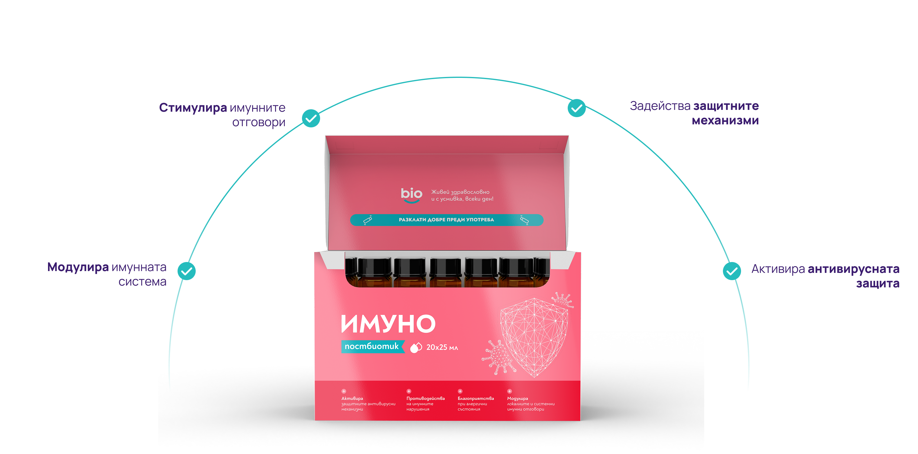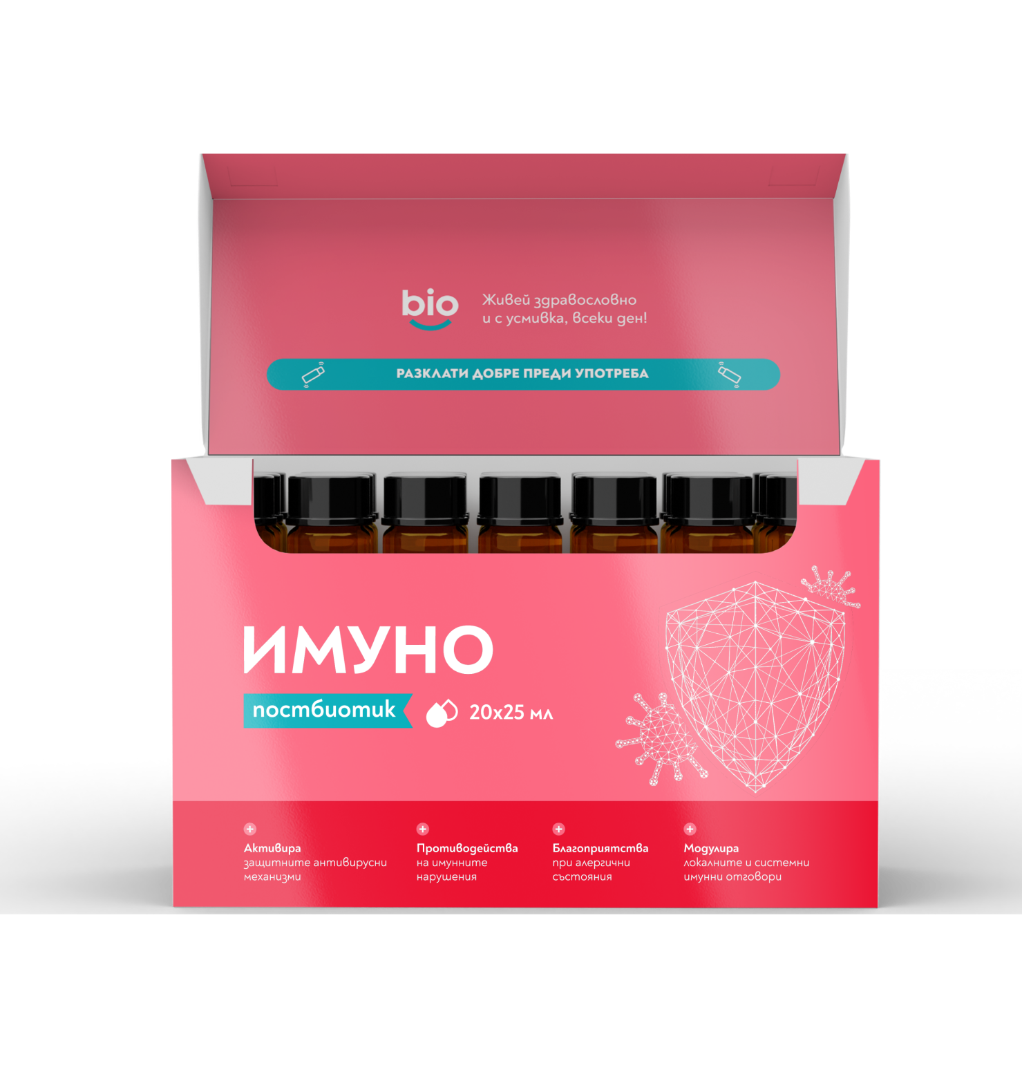 Като мощен имуномодулатор, постбиотикът „Bibiotic®Имуно“ се явява ефективен противовирусен препарат. И това е едно от най-ценните му качества. Като такъв, той е изключително ефективен при всякакви грипни вируси, коронавируси и прочие вирусни инфекции, при което може да се използва като основно терапевтично средство. Всички знаем, че вирусните инфекции не се лекуват. С тях се справя имунната система. И ако тя получи помощ отвън, ще се справи с болестта по-лесно. Като имуномодулатор, „Bibiotic®Имуно“ активира и регулира имунната система така, че тя да може бързо и ефективно да се справи с вирусните инфекции. Освен това, той предоставя на организма ценни биологични вещества, като ензими, витамини, органични киселини и др., които ограничават появата на различни разстройства, причинени от инфекцията, като гадене, повръщане, диария, коремни спазми, болки и дискомфорт. „Bibiotic®Имуно“ подсигурява на организма и антибактериални метаболити, които намаляват възможността вирусната инфекция да прерасне в бактериална. В допълнение, „Bibiotic®Имуно“ подобрява чревната бариера, с което ограничава възможното проникване на токсини в организма и появата на допълнителни усложнения.